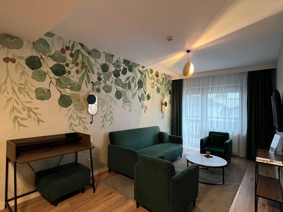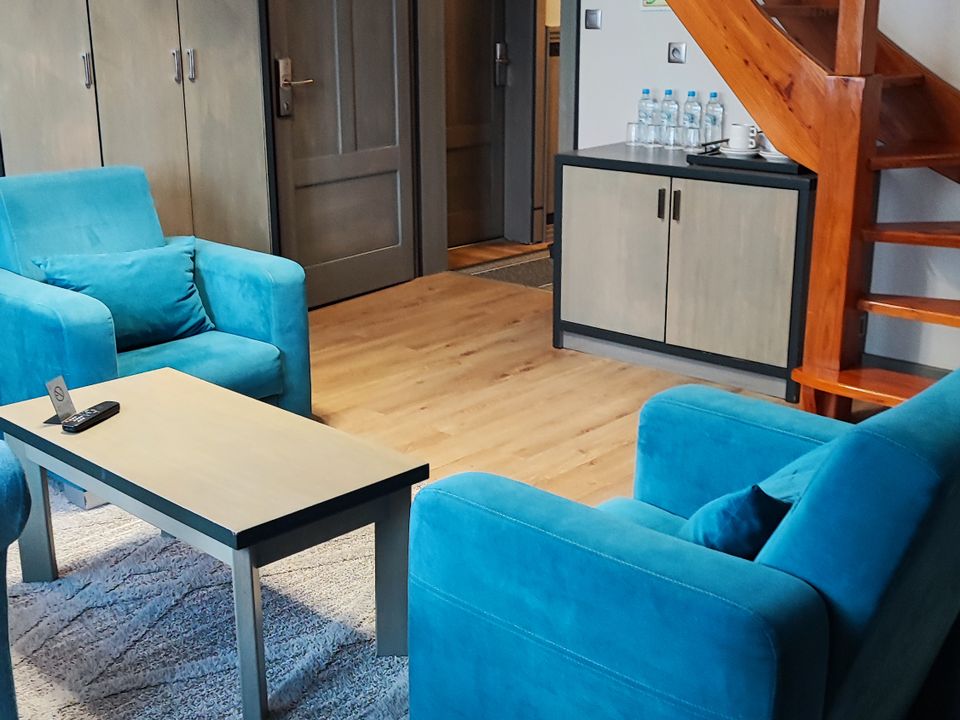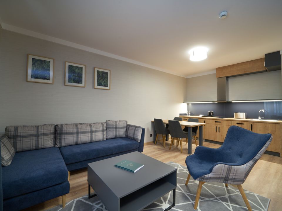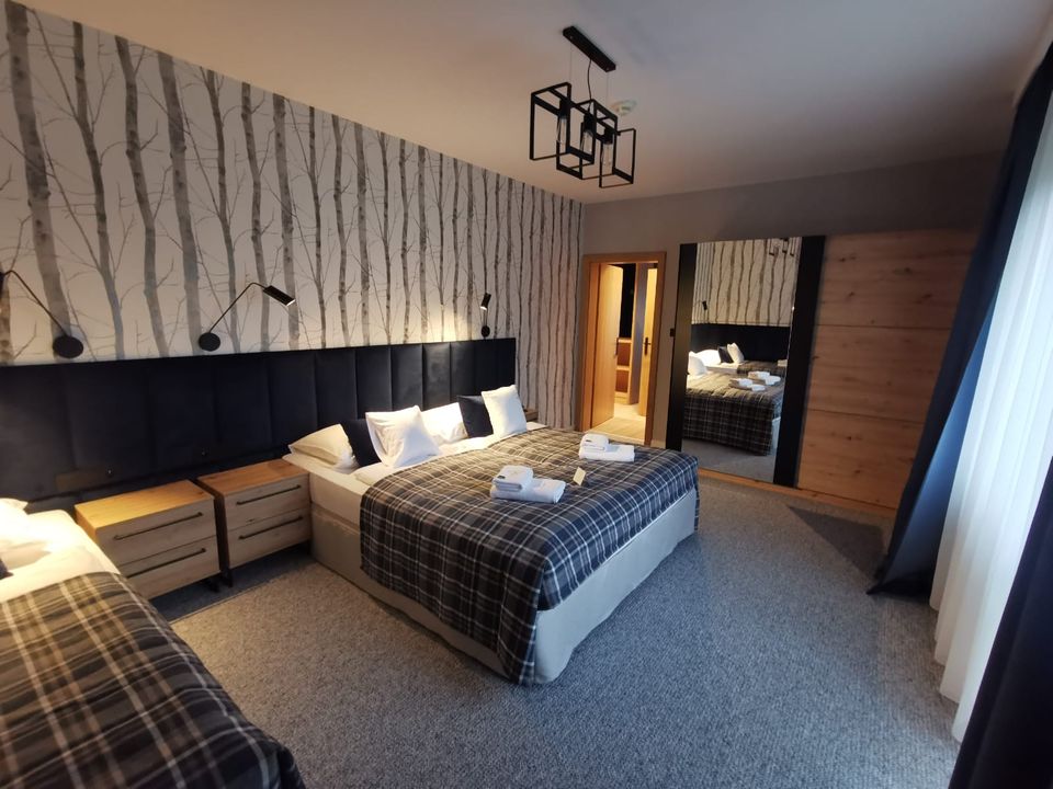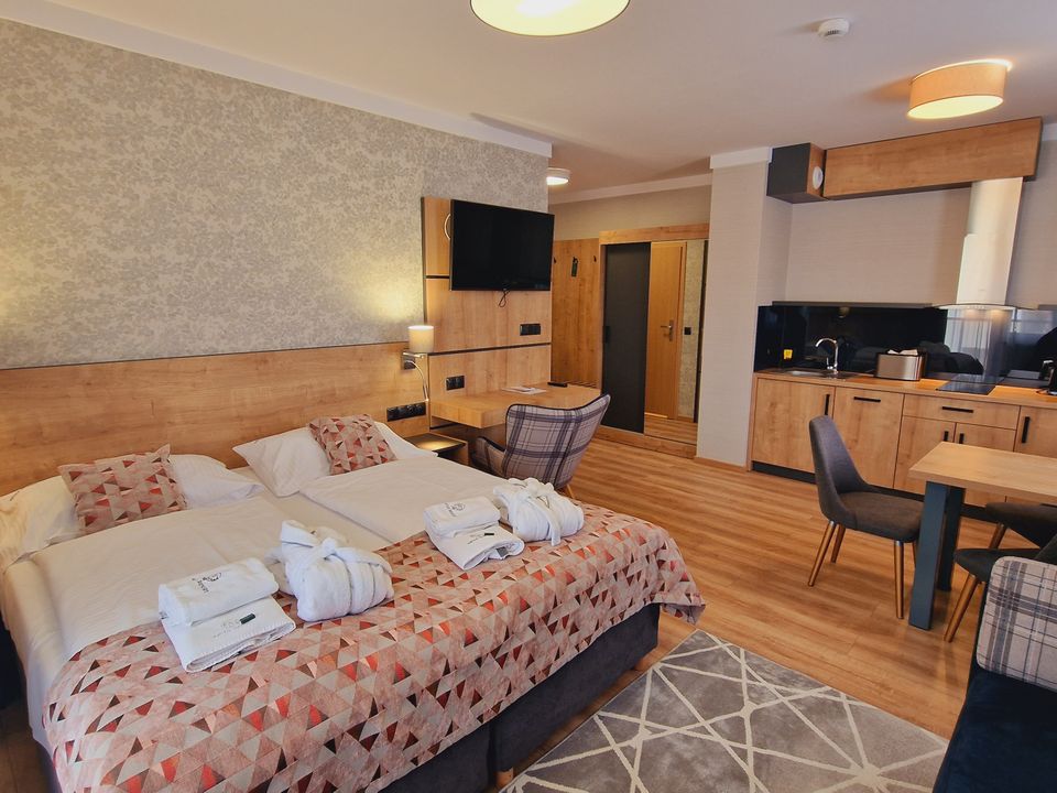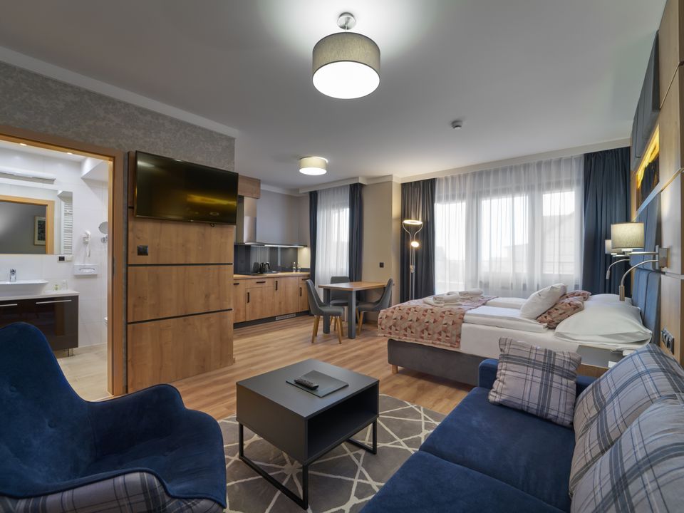 Dvoupokojový apartmán 55 m2. SKládá se z obývacího pokoje z otevřeným kuchyňským koutem, zamykatelnou ložnicí a moderně zařízené ložnice.
