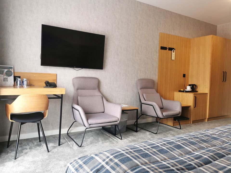 Pokoj s vyšším standardem a velkou plochou. Manželská postel o šířce 180 cm a odpočinkový kout. Televizor LCD 55". V koupelně je vana.